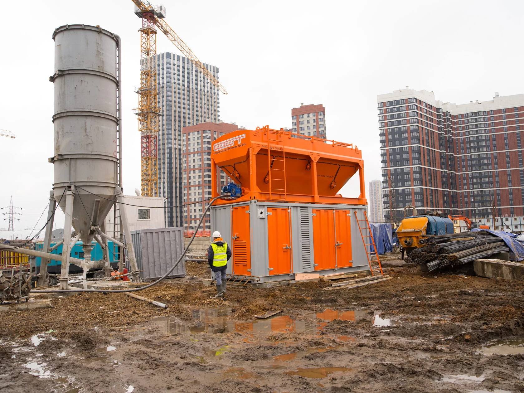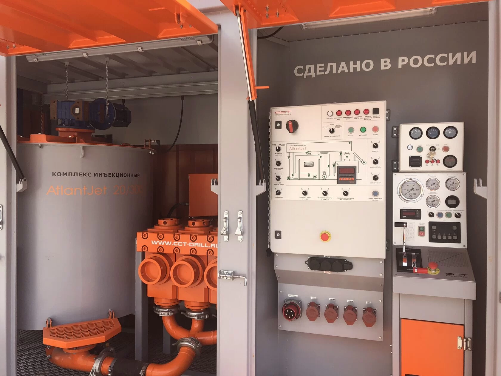 AtlantJET 300 enjeksiyon kompleksi, standart bir konteyner boyutlarında kompakt bir şekilde yerleştirilmiş bir karıştırma istasyonu ve bir yüksek basınç pompası içerir.